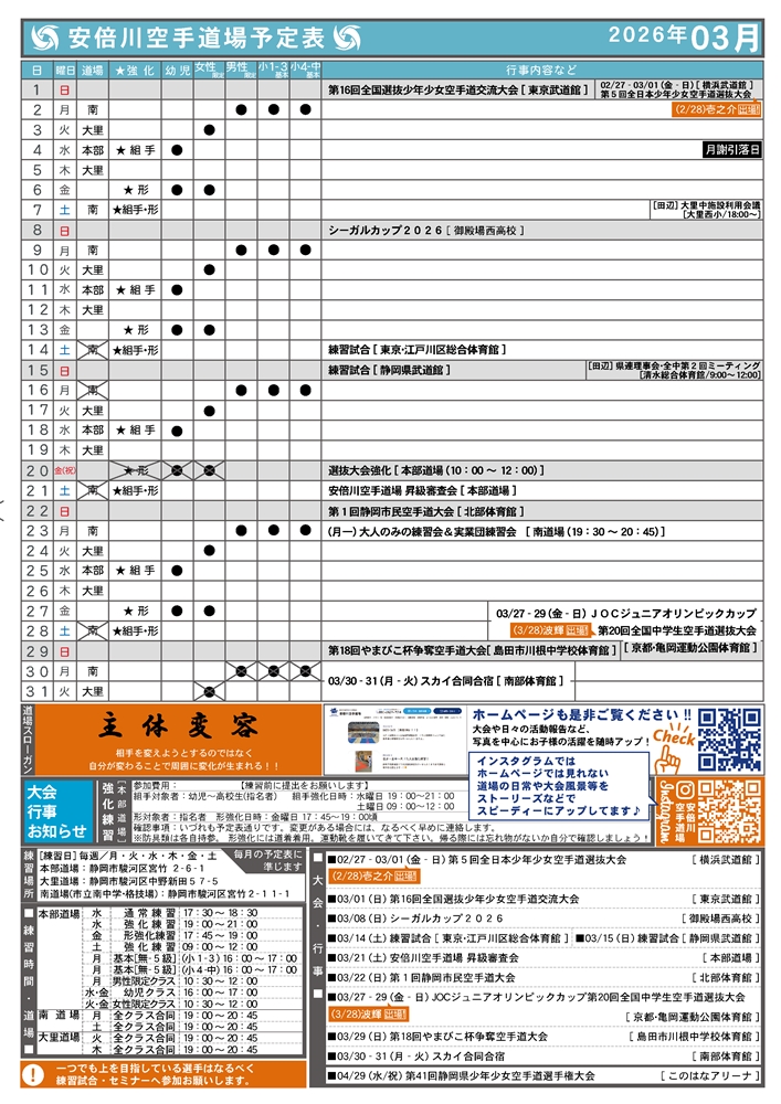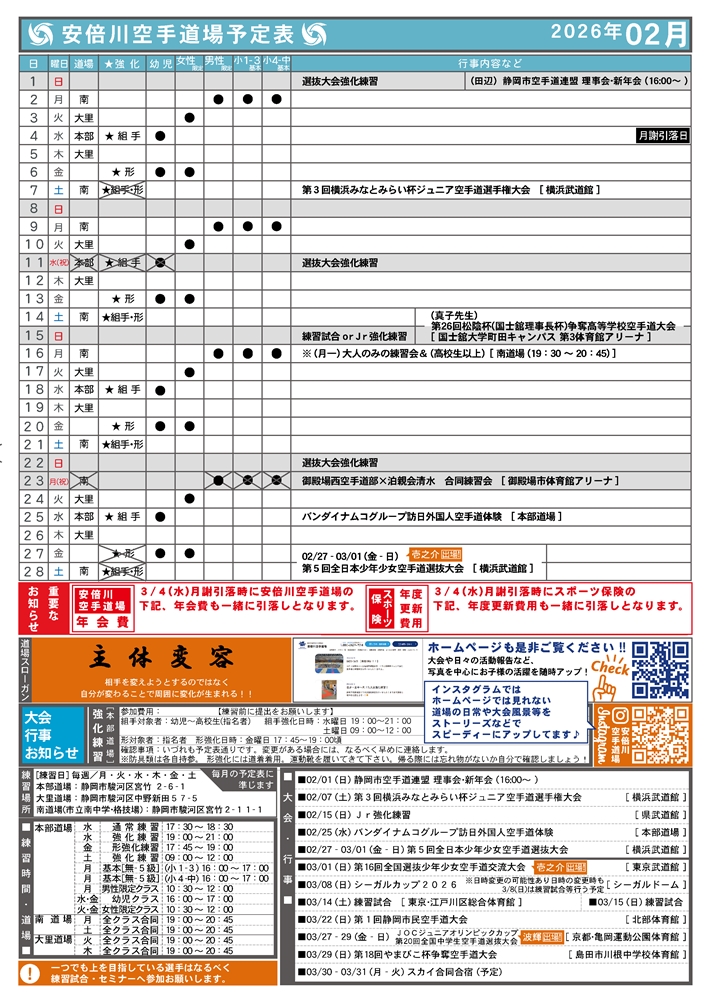 安倍川空手道場では、全年齢対象の「全体クラス」、